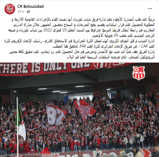 ومن جهتها، أعلمت إدارة شباب بلوزداد، أنصار الفريق، أنها تقدمت بطلب إلى “الكاف” عن طريق “الفاف”، وأنها قامت بكل الإجراءات اللازمة، من أجل حضور الجماهير في مباراة الجولة الثانية المرتقبة هذا السبت في ملعب 5 جويلية، أمام الترجي التونسي.