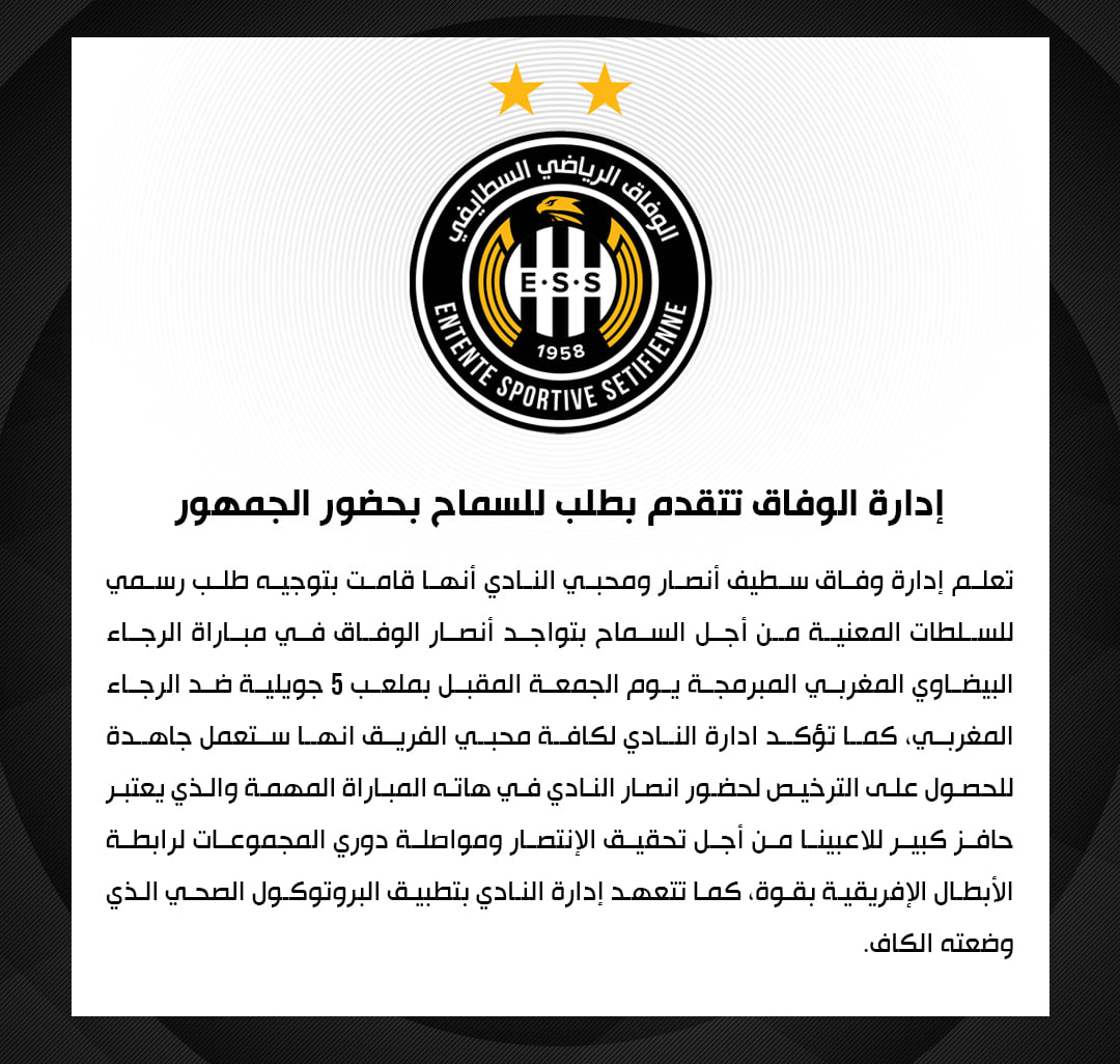 تقدمت إدارة وفاق سطيف بطلب رسمي إلى السلطات المعنية من أجل حضور جماهير الفريق في مباراة الجولة الثانية من رابطة أبطال إفريقيا أمام الرجاء البيضاوي المغربي..
